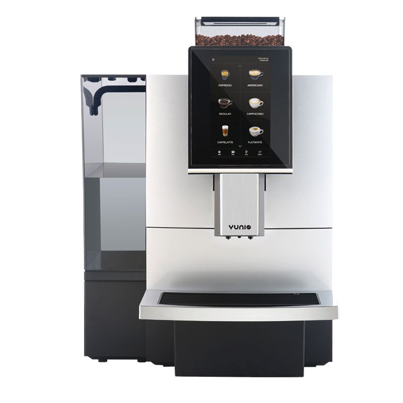 Belangrijkste informatie over Yunio X41- LEVERTERMIJN 6 à 7 WERKDAGEN- 24 maanden garantie (2jaren)- Onderhoudscontract mogelijk Uitgebreide informatieYunio zijn volautomatische koffiemachines, ideaal voor kantoren en kleine horecazaken. Met hun compacte formaat en elegante uiterlijk passen deze toestellen in vele locaties zoals koffiepantry’s, vergaderzalen, showrooms, restaurants, bars …KenmerkenAfmetingen Hoogte X Breedte X Diepte (mm)580X410X500Gewicht (kg)18Aanbevolen inzet Aanbevolen dagelijkse productie (koppen)40Aanbevolen jaarlijkse productie (zettingen)10.000Aanbevolen aantal kilo’s maximaal90Capaciteit per uur (DIN18873-2) enkel – dubbel Espresso (50ml)702 x Espresso (50ml)100Americano (240ml)50Cappuccino (X20 = 180ml, overig 220ml)502 x Cappuccino (X20 = 180ml, overig 220ml)60Theewater in liter25Inhoud Inhoud watertank in liter8Capaciteit bonencontainer in gram1.000Capaciteit Canister voor instant melk of choco in gramn.v.t.Drablade (aantal puks (10 gr per zetting))±70Technische Specificaties Vermogen bij stroomaansluiting 220 – 240V in Watt2.700 – 3.300Vaste wateraansluitinginstelbaarVaste waterafvoeroptioneelMelksysteem MelkschuimjaInstant melk of chocomelkneeStoompijpneeIngebouwd spoelventiel voor reiniging melksysteemnee