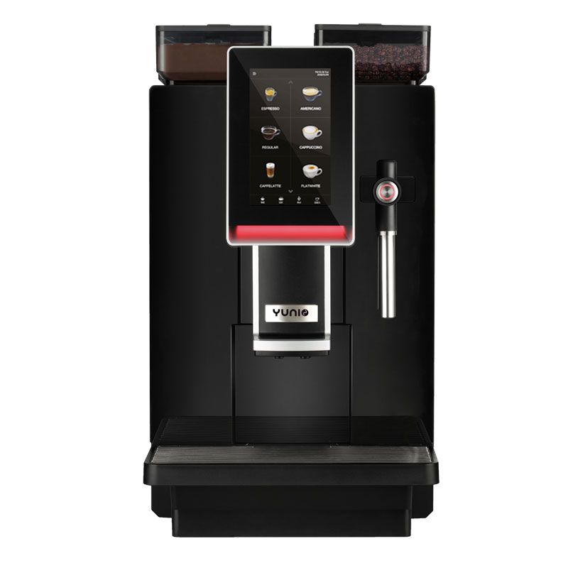 Belangrijkste informatie over Yunio X80- LEVERTERMIJN 6 à 7 WERKDAGEN- 24 maanden garantie (2jaren)- Onderhoudscontract mogelijk Uitgebreide informatieYunio zijn volautomatische koffiemachines, ideaal voor kantoren en kleine horecazaken. Met hun compacte formaat en elegante uiterlijk passen deze toestellen in vele locaties zoals koffiepantry’s, vergaderzalen, showrooms, restaurants, bars …KenmerkenAfmetingen Hoogte X Breedte X Diepte (mm)620X340X545Gewicht (kg)26Aanbevolen inzet Aanbevolen dagelijkse productie (koppen)50Aanbevolen jaarlijkse productie (zettingen)15.000Aanbevolen aantal kilo’s maximaal135Capaciteit per uur (DIN18873-2) enkel – dubbel Espresso (50ml)1002 x Espresso (50ml)n.v.t.Americano (240ml)80Cappuccino (X20 = 180ml, overig 220ml)802 x Cappuccino (X20 = 180ml, overig 220ml)n.v.t.Theewater in liter30Inhoud Inhoud watertank in liter4Capaciteit bonencontainer in gram1.500Capaciteit Canister voor instant melk of choco in gram1.200 of 2.000Drablade (aantal puks (10 gr per zetting))±70Technische Specificaties Vermogen bij stroomaansluiting 220 – 240V in Watt2.700Vaste wateraansluitinginstelbaarVaste waterafvoeroptioneelMelksysteem MelkschuimjaInstant melk of chocomelkjaStoompijpneeIngebouwd spoelventiel voor reiniging melksysteemja